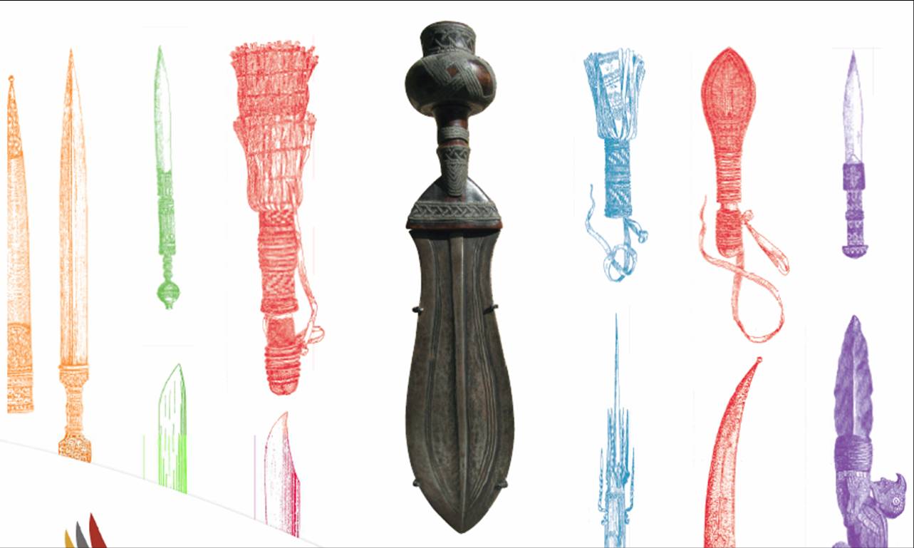 Collectionneur, Jean-Claude Herrera-Gutierrez cherche au gré de ses voyages les armes et outils façonnés par les tribus du monde entier. Leurs lames sont fondues, forgées ou taillées dans la pierre, la corne, l’ivoire et le bois. Si le fer allie résistance et efficacité du tranchant, la préciosité du cuivre, du bronze ou de l’argent transforme une arme redoutable en objet symbolique.