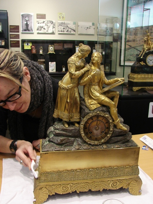 Les collections du musée se font toutes belles pour le Printemps : opération nettoyage des pendules en bronze doré !
